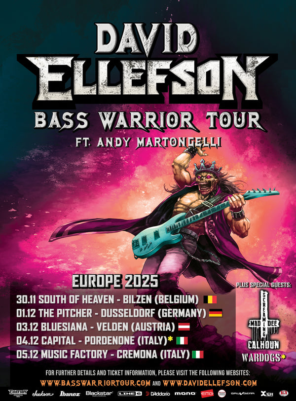 GRAMMY Award winning bassist DAVID ELLEFSON has announced his BASS WARRIOR TOUR in Europe for winter 2025. The tour will feature Ellefson and his solo band performing select cuts from his well-known catalog of Mega hits, solo material and other hard rock & metal favorites which inspired him during his 40-year music career. Direct support on all dates is Screaming Mad Dee Calhoun. Wardogs will be joining as additional support on December 4th. Ellefson states, "It's been a super fun and productive year and even more so to be able to close out the calendar one last time with my Bass Warrior shows across Europe. I'm excited to be taking this show into new cities as we celebrate each night with songs from across my career and more!" Ellefson launched his Bass Warrior tour in 2024, with musical director Andy Martongelli (Ellefson-Soto, Artemis) as a way to perform songs for fans across Europe from his 40+ years as a world renowned recording artist.